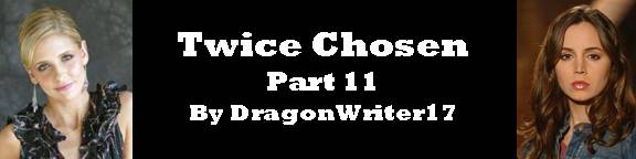 Disclaimer: All of the materials borrowed from Buffy the Vampire Slayer belong to Joss Whedon and to the entities and companies associated with their creation. I have borrowed them for creative and entertainment purposes only. No compensation has been or ever shall be received for the writing below. No copyright infringement is intended. My Website: http://www.dragonwriter17.net/ Feedback: Yes, but only if it’s of the non-flamey variety: DragonWriter17@aol.com Distribution: The Watchers Forum, The Mystic Muse, and my personal site (If you are interested in posting my story on your site, please contact me first for permission.) Spoilers: BtVS Season 3’s “Faith, Hope, and Trick” (and beyond) Pairings: Buffy/Faith Author’s Notes: (1) See the first three chapters for detailed notes on the origin of this story. (2) This part picks up where Part 10 left off. It continues in mostly original territory. (3) For Faith’s backhistory for this series, I am using the novel Go Ask Malice: A Slayer’s Diary by Robert Joseph Levy (excellent book, by the way). I may not use all of its plot details or use them exactly as they appear in that novel, but I am assuming that Faith’s past in “Twice Chosen” is very similar to Faith’s past in Go Ask Malice. (4) I have two new banners, both of which I made. The one at the top I made with PowerPoint, and it contains pictures of Buffy and Faith in their "dinner with mom" outfits. The one at the bottom I made with the little Paint program. I just loved the way Buffy and Faith looked at each other in that screencap from BTVS Season 3's "Faith, Hope, and Trick". (5) Thanks, as always, to Lilly for the beta read and edit! By the way, Lilly won Best Beta in Round 11 of the SunnyD Awards for her work on this story. Congratulations, Lilly! Number of Chapters: Current Plan = 18 chapters Complete: 11